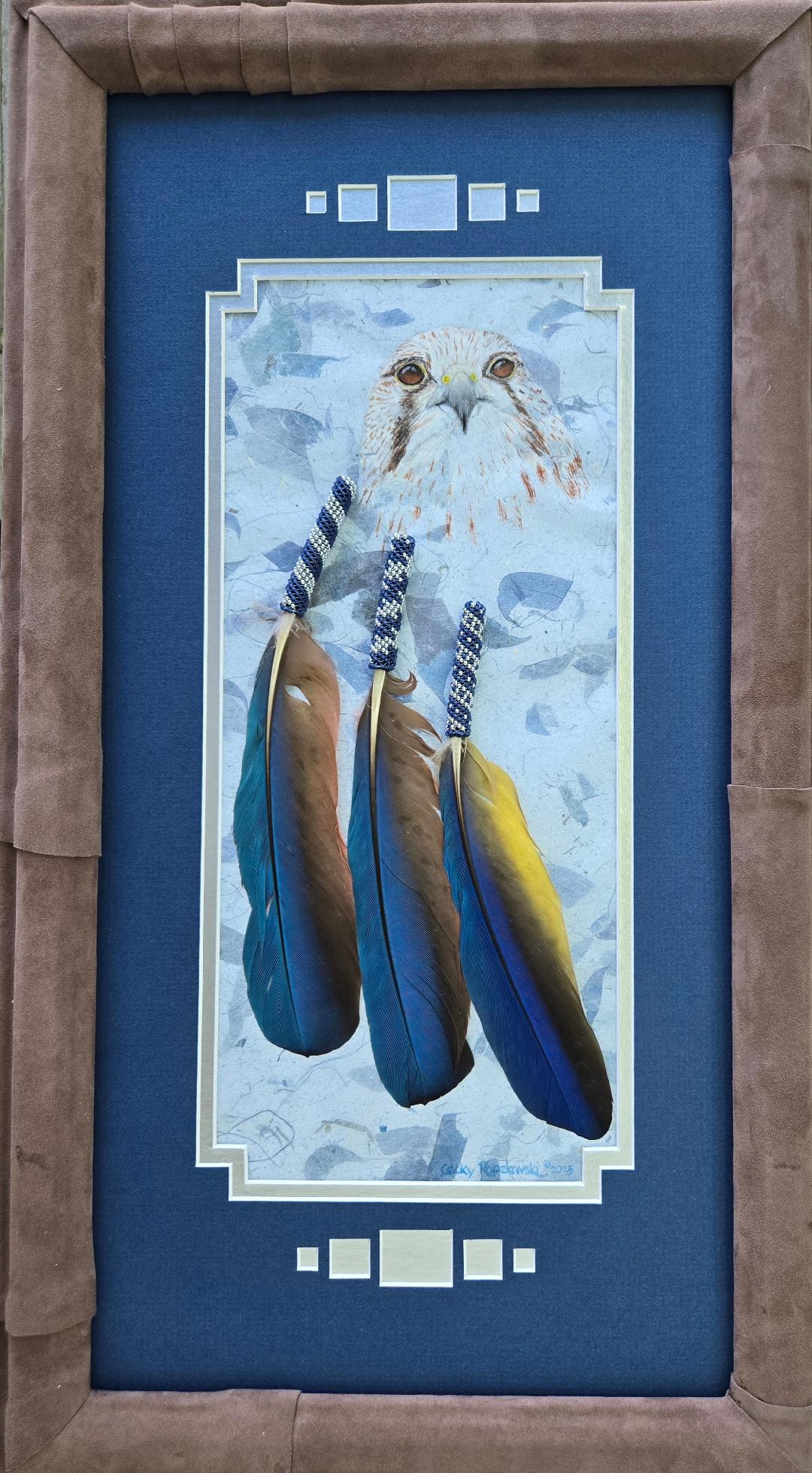 Original watercolors on handmade paper influenced by Native American spirituality. Embellished with beading, feathers, leather, stones and fur. Frames are wrapped in leather. |